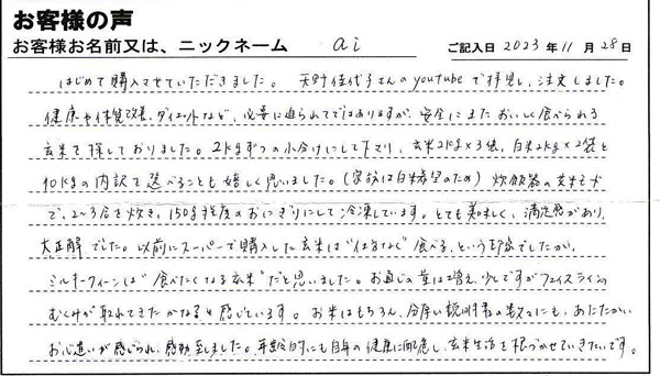 aiさんには、ミルキークイーン玄米をお買い上げいただきました。